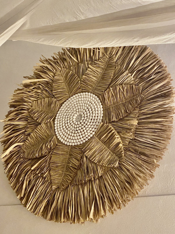 Prachtige XL wanddecoratie Juju Seraya van wel 100cm diameter! Handgemaakt van Alang Alang gras met ingelegde schelpen.
