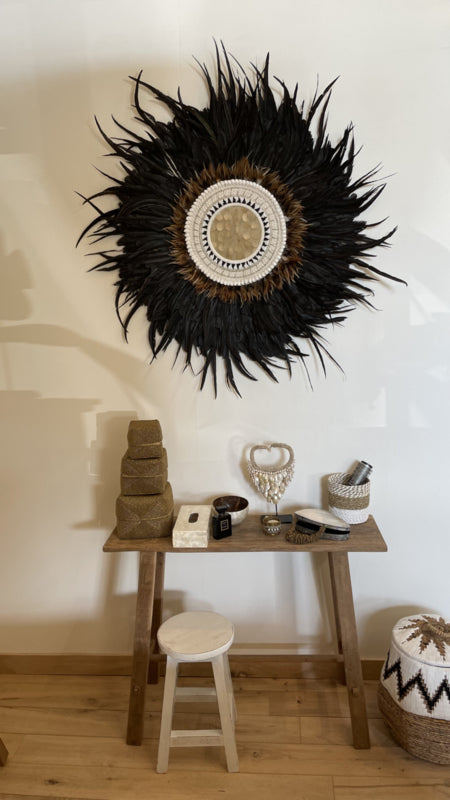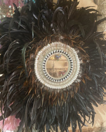 XXL ronde spiegel Juju Amed met veren en schelpen van wel 115cm diameter!